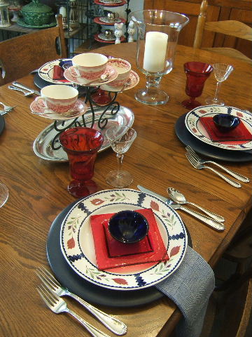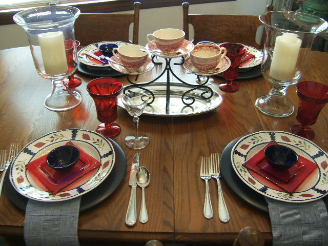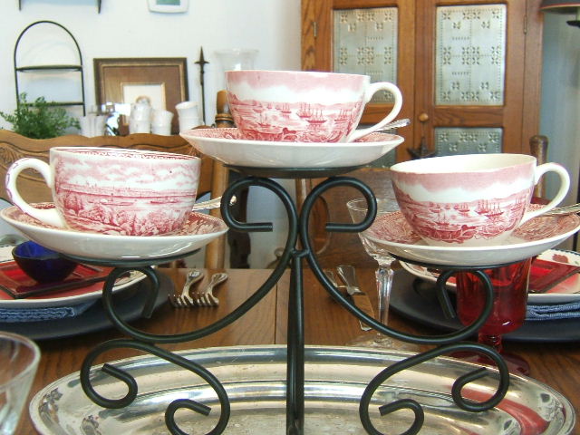 The centerpiece also had a switch to red as I removed the blue teacups and substituted with the red transferware cups.