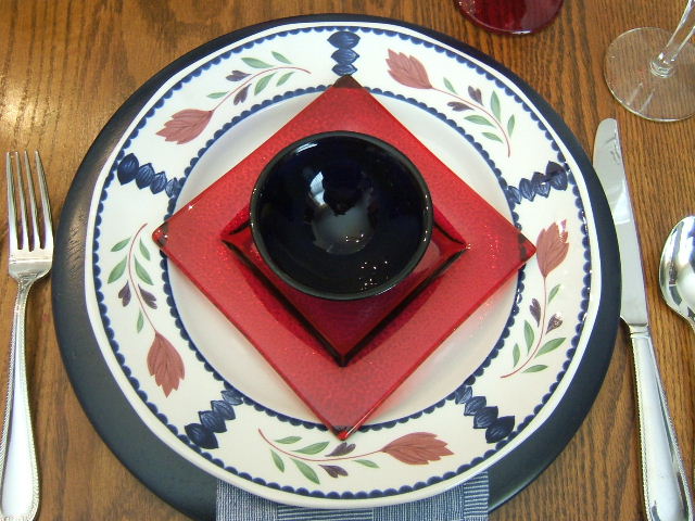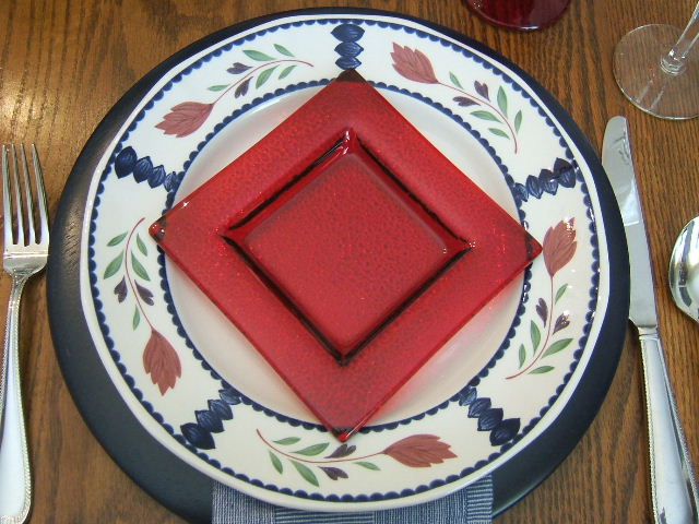 Then I layered red square glass plates from Fortessa and topped with the same blue Fortessa bowl from last week’s tablescape.
