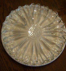 For my first purchase of the day, I picked up ten clear glass sunflower-shaped dinner sized plates. They are a little hard to see in this picture even though I’ve placed a white plate underneath. I paid $15 for ten. “S” already had these plates so we didn’t have to flip for them.