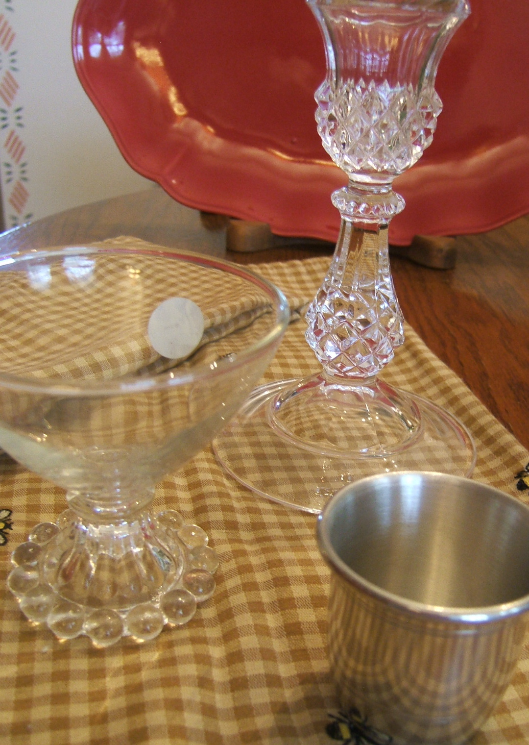I picked up a little candlewick (or Boopie?) sherbet/champagne glass for $1, a glass candlestick (“S” always finds the best candlesticks!) for $3, a tiny pewter cup for $2, and two large honey-gold checked napkins embroidered with sweet bees for $4. You can’t see those bees, but trust me they’re there and they’re cute.
