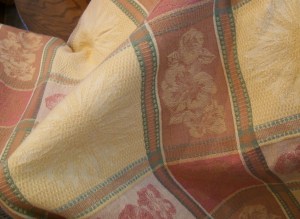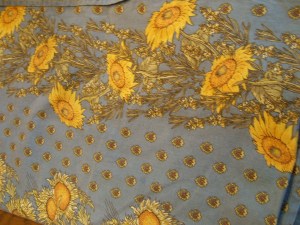 Still more to unload from my cart. I found a vintage dresser scarf for $2.50 (future table runner?), a large blue tablecloth with sunflowers ($5 due to a small stain), and another large tablecloth in predominately yellow with flower designs for $7. “S” found this last tablecloth for me. She has a good eye and a generous heart.