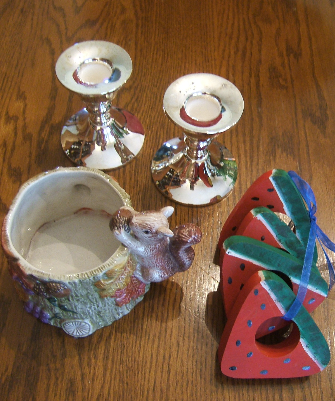 I also picked up the placemats in the photo. There were three of them for $1 each. I knew I had one in this same design at home so this trio would complete my set. I also found a sweet Fitz & Floyd planter ($1 can you believe it?), 2 silver-plated candlesticks (just cuz they were real shiney) for $1 each, and some wooden watermelon napkin holders for $1.