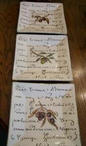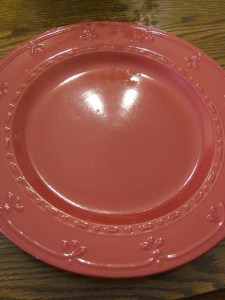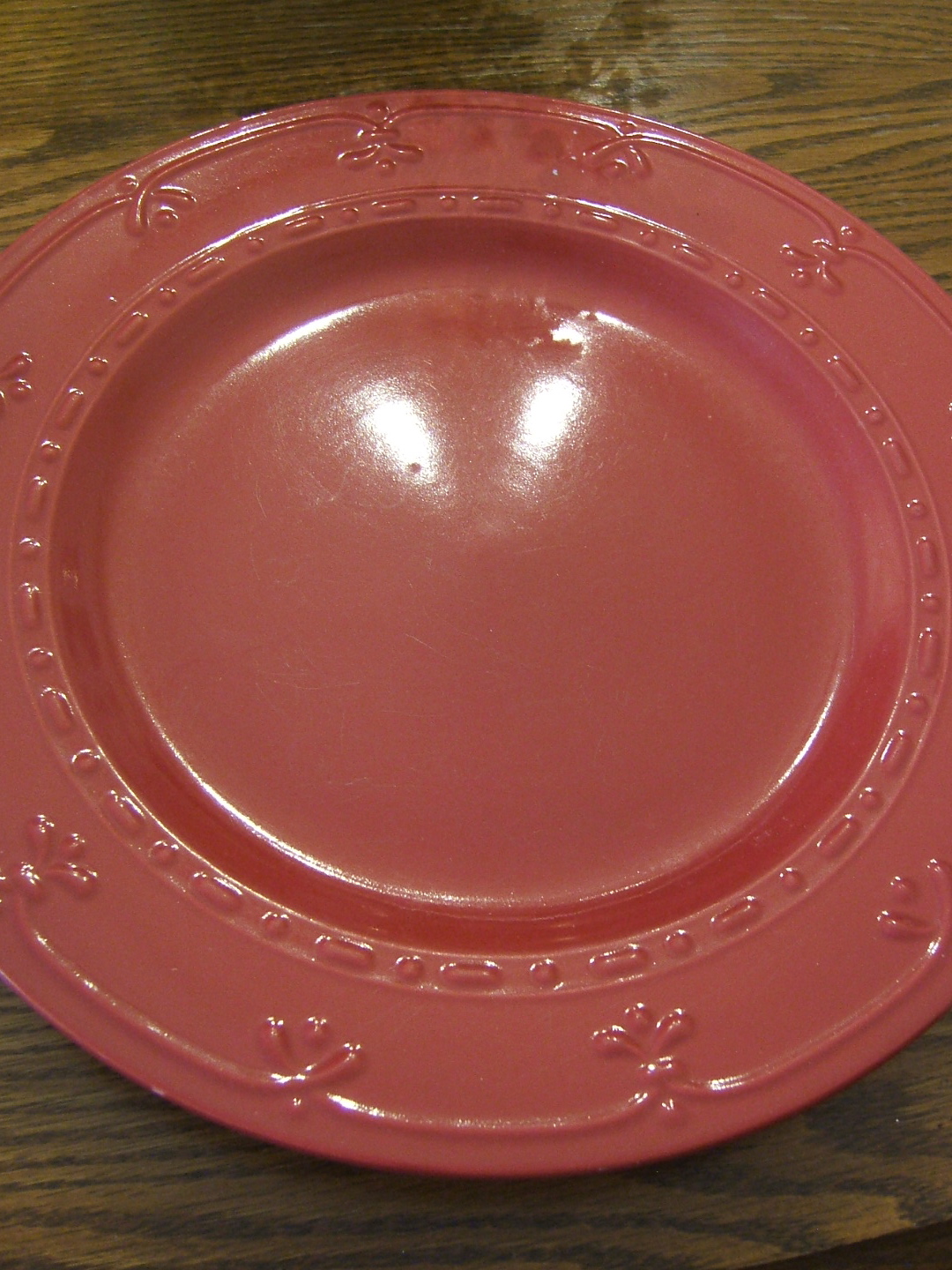 I also picked up some Williams Sonoma square plates with olive designs. These were $2 each. In each store, “S” and I tried to meet a $15 minimum. We had coupons which activated at $15 so sometimes we threw extras into our basket to make our minimum. I added these at the last minute to help round out my minimum. “S” found this red plate for me since she knows red is one of my colors. She is trying to put together a patriotic tablescape for me, even though she may not realize it. Last week she found me some small plates rimmed with navy and white stars. See what I mean?