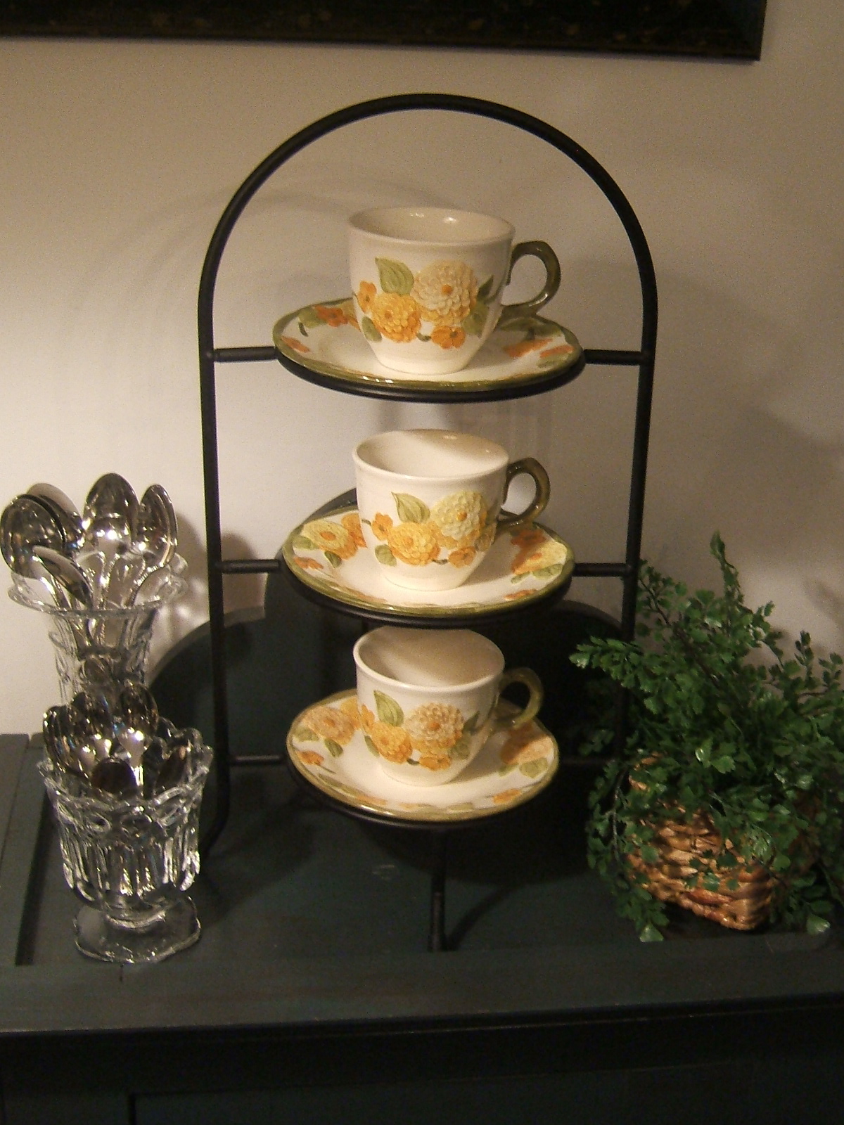 When I found this tiered plate stand at a local thrift recently, I knew I would put it to good use. The sweet little cups from the Metlox Sculptured Zinnia PoppyTrail dishes set (here) were calling to me to be featured in a vignette. The two combined and this is the result.