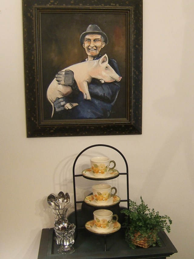 to smile. The yellows and greens of the zinnias are soft, subtle and yet pop on the cream background. I added two spooners I purchased from what was formerly Southern Living at Home and a yard sale greenery piece to round it out. I thought you might enjoy a glimpse at the heart- warming oil painting hanging above this vignette. “Man with Pig” was painted by my very talented husband. It’s one of my favorite things. I love the farmer’s expression.