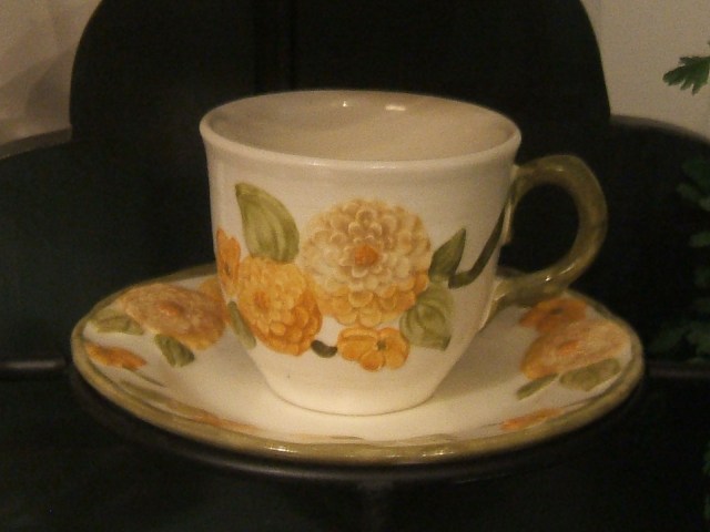 Those are the cutest teacups. Love the yellow zinnias. They look so nice in the vignette you have created. Thank you for stopping by! Hugs!