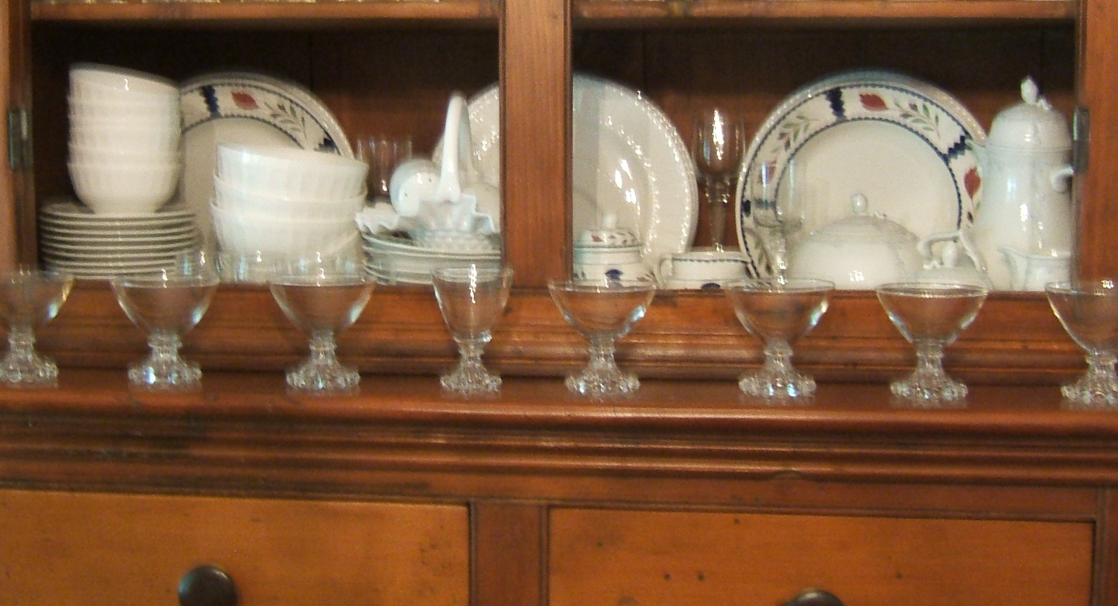 Here they are lined up on my hutch. The glass in the center is also a Boopie, but a smaller size. You’ll notice that there are actually seven larger glasses; I had one lonely Boopie champagne who is lonely no longer.