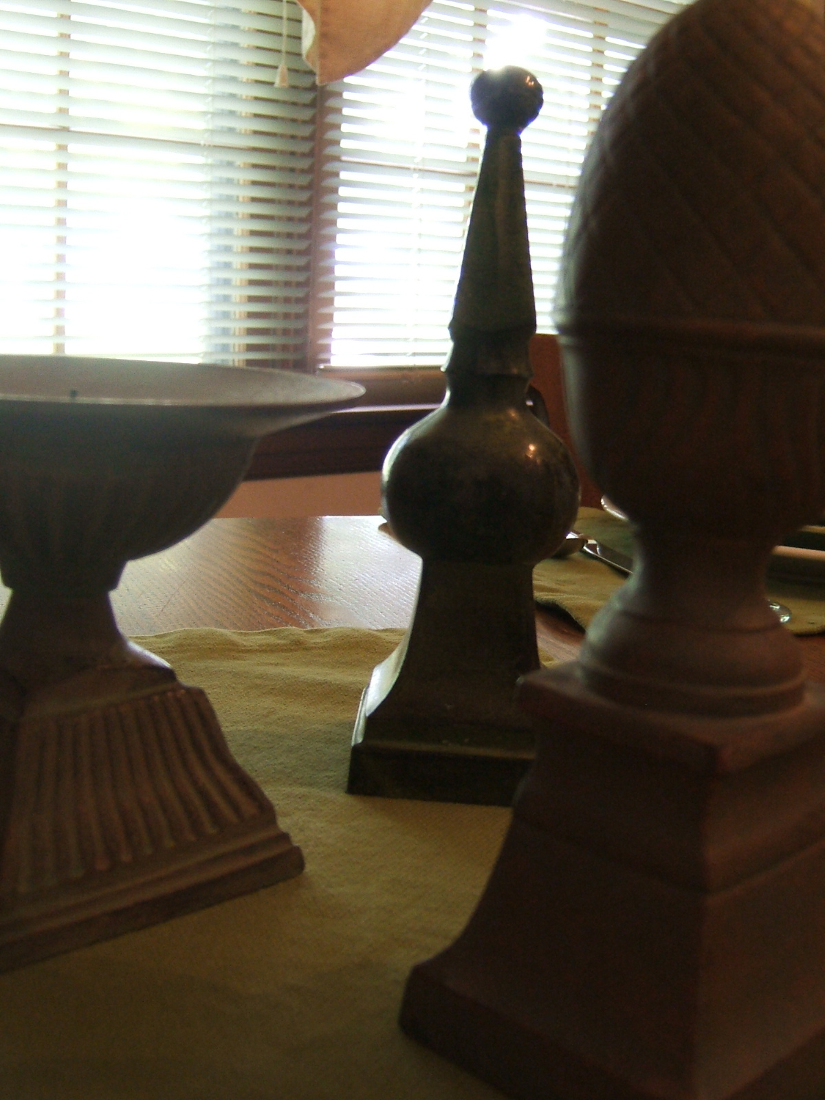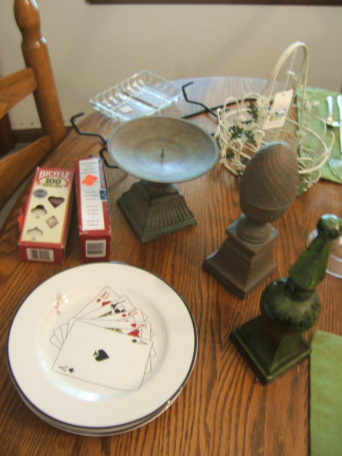 The plates are Casino Royale by American Atelier. After I picked them up, I knew I had to circle around and get those poker chips, too. The clerk was delighted I got them as she was sure they were going to end up all over the floor after some unsupervised child found them. I hope to remove the spike from the candle urn as I feel it will be much more useful without it. The two architectural pieces I found too interesting to leave behind. The green spiral is quite heavy. It may have to have a paint job, though, I’m not quite sure about that yet.