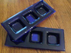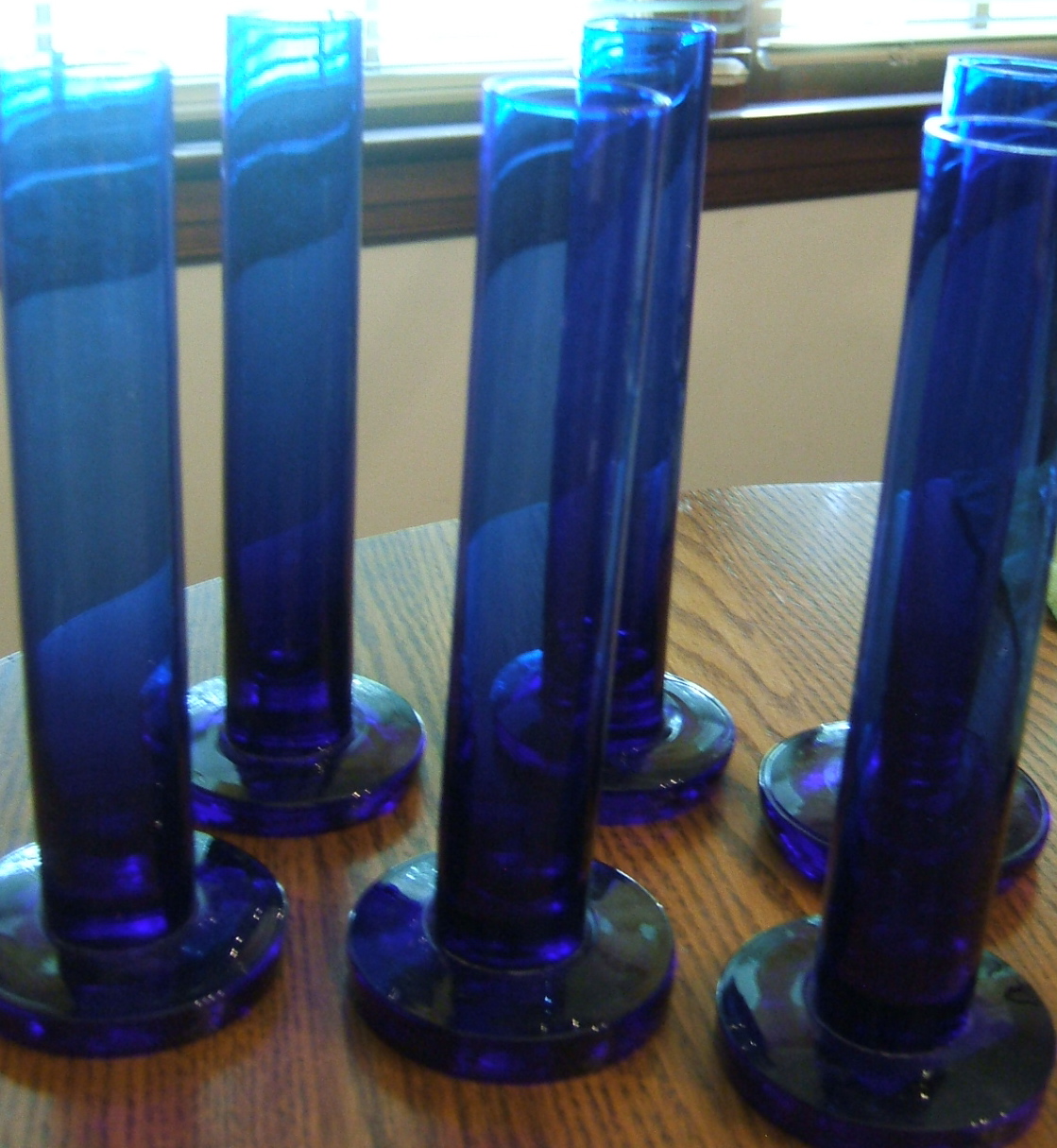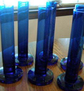 I love these cobalt blue items. The test-tube looking pieces are bud vases. The two trays are dipping trays, but I think they would look great with little votives.  I