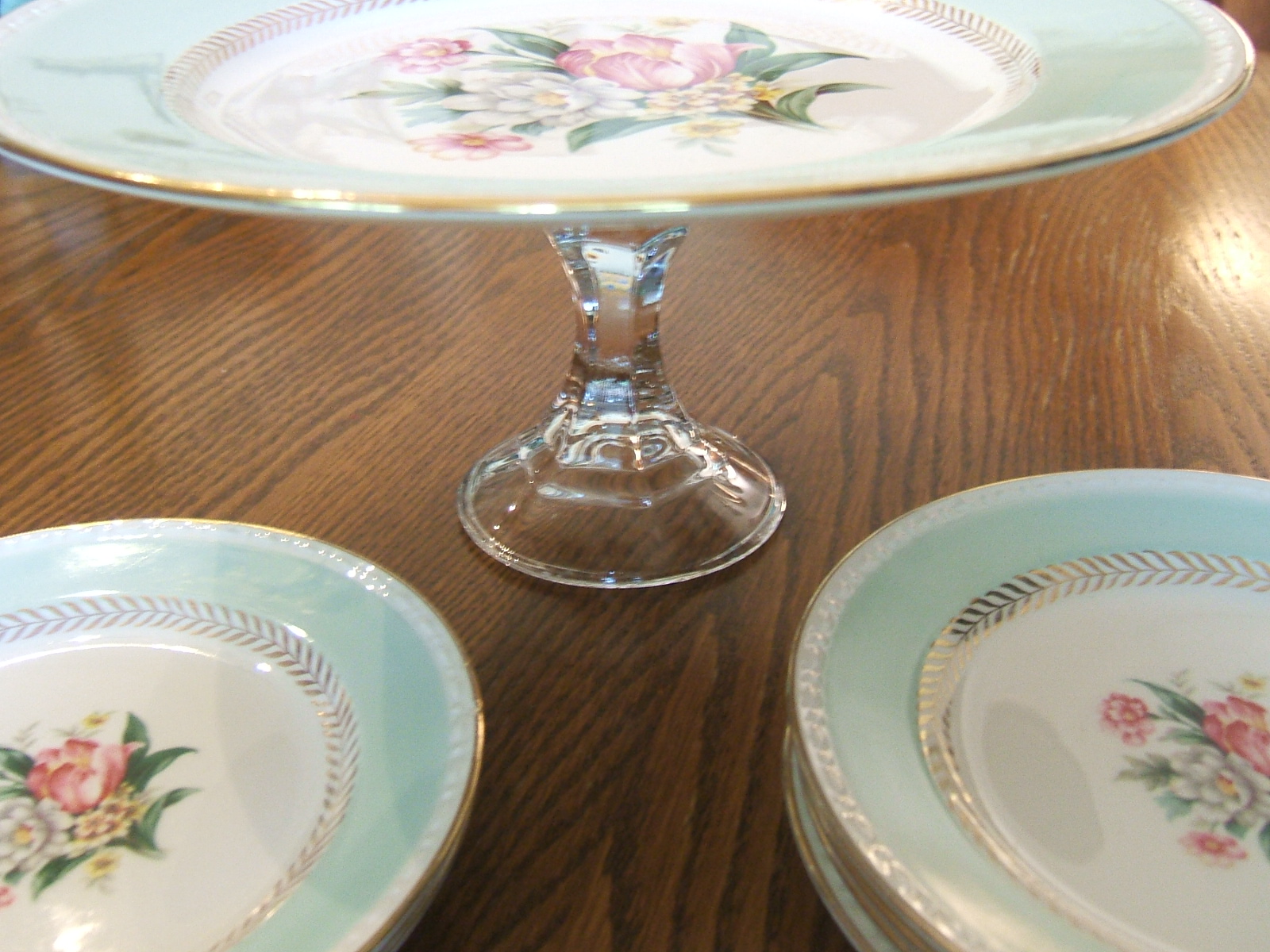 I’d been wanting to make a cake stand using a candlestick and here was one already done for me for only $4.99.  There were also eight tiny dessert plates (actually bread and butter plates, I think, but I’m calling them tiny dessert plates) for 99 cents each.