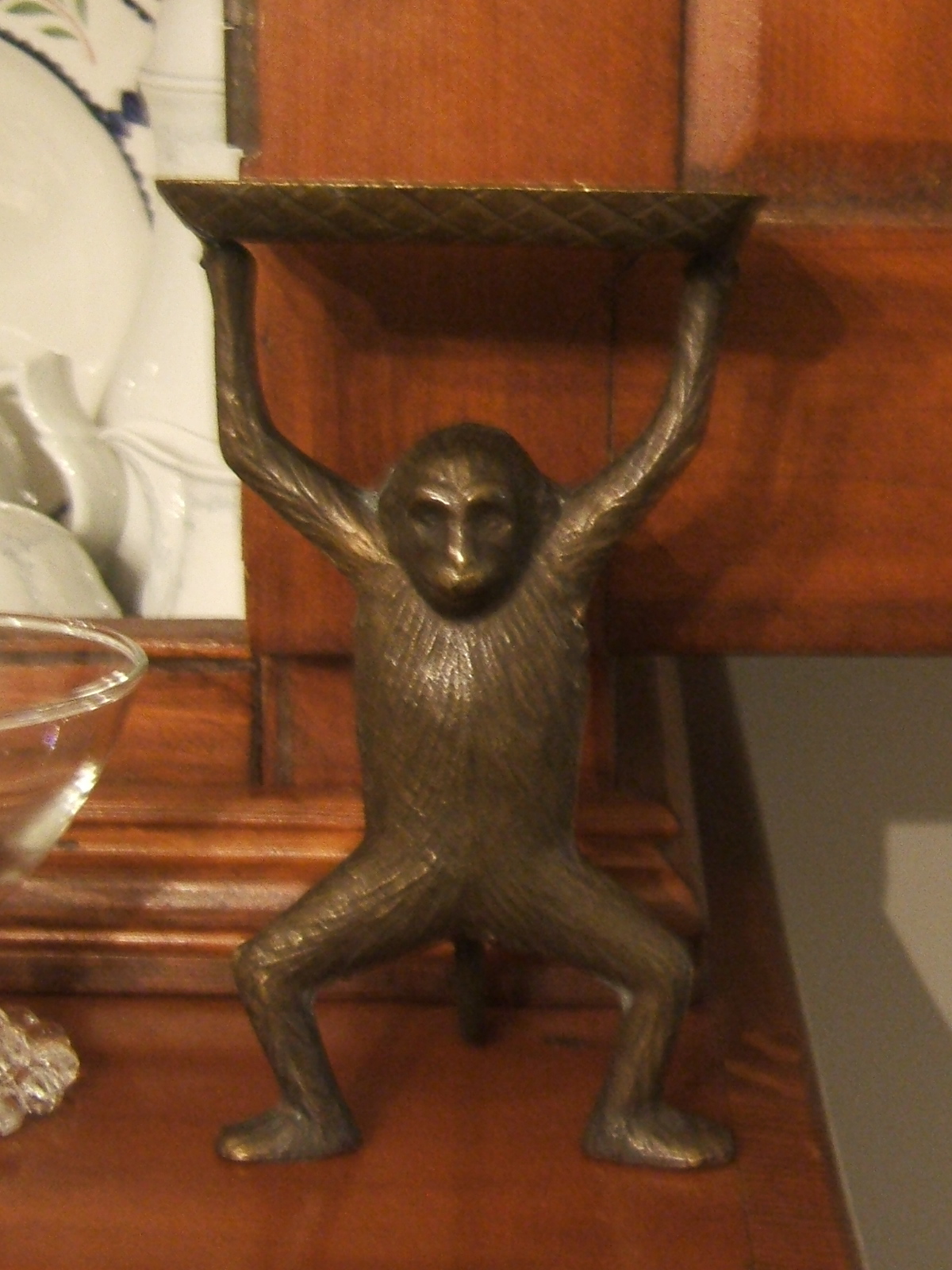 This little monkey looked like something my husband would appreciate. For 75 cents, he had to come home, too. I thought he could hold business cards; my friend said he might make a good soap holder. A square candle would look pretty cool, too. Any ideas?