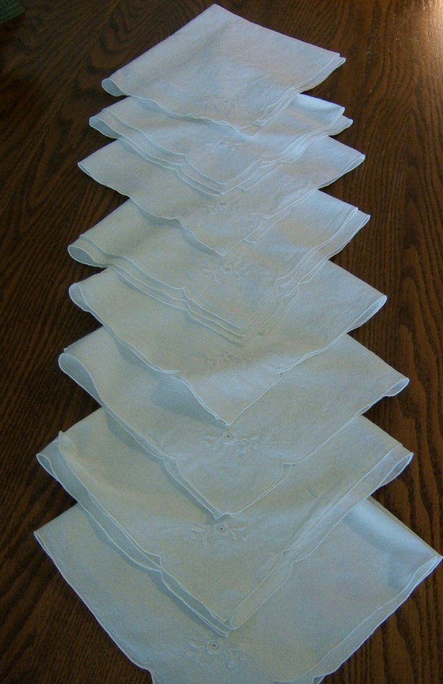 I picked up a box full of clear glass plates and bowls with an embossed flower design and eight shell-shaped clear glass dishes. I got a paper bag full of napkins for $2 and then in my second run I picked up another eight white napkins with a flower in the corner.