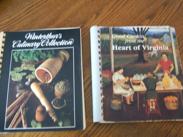 I can’t resist an interesting cookbook so I picked up these two to add to my collection. I like to read cookbooks, especially those produced by service groups as fundraisers. The Good Cookin’ from the Heart of Virginia has some lovely paintings featured at the beginning of each chapter. Please forgive my blurry pictures. Between no sun and a camera on strike, many of my pictures are not what I would prefer them to be.