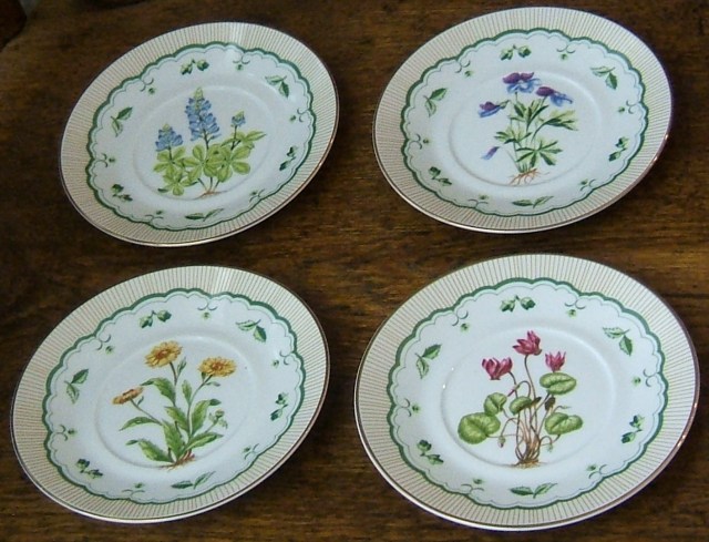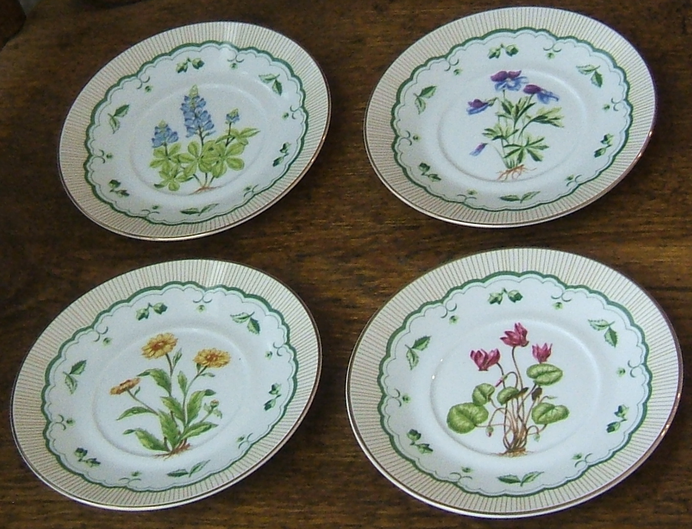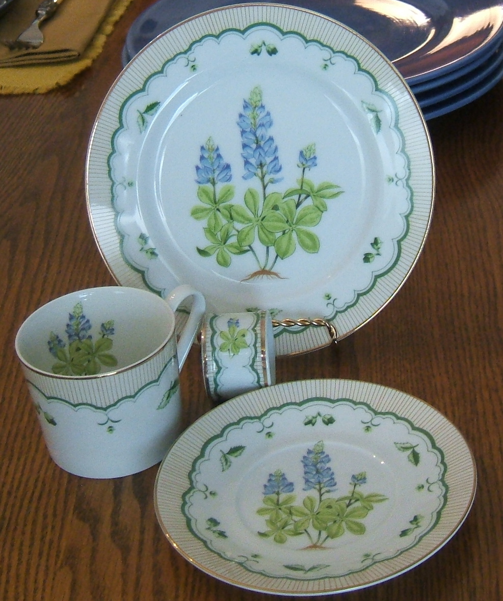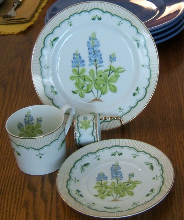 The box included four cups, saucers, salad/dessert plate, and napkin rings. There are four different designs: Corn Marigold, Texas Bluebonnet (shown above), Cyclamen, and Bird’s Foot Violet. They are each edged in gold. They are From the Private Collection of Georges Briard, the Victorian Garden. I just fell in love with them and feel very fortunate that “S” is so willing to spot and share. This whole set cost only $7.75.