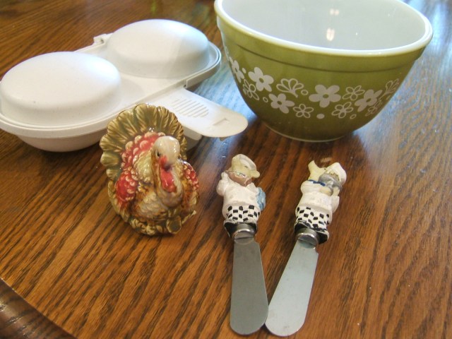 I had gone looking for some potential purchases “spotted” by my good friend ‘S’. They didn’t work out, but I was not prepared to leave empty-handed. I found this sweet little green pyrex mixing bowl tucked inside a box filled with a dish set. The Boston Warehouse piggy chef spreaders are always so handy for daily use. I have a bowl filled to the brim with spreaders we use every day. I had spied the tiny turkey salt shaker on a previous visit and left him behind. Today, he jumped into my hands. The Nordic ware egg cooker is the second such device I have found. The first was for my daughter who highly recommends it for micro cooking of eggs. I’m giving this a try for those hurried workday morning breakfasts.