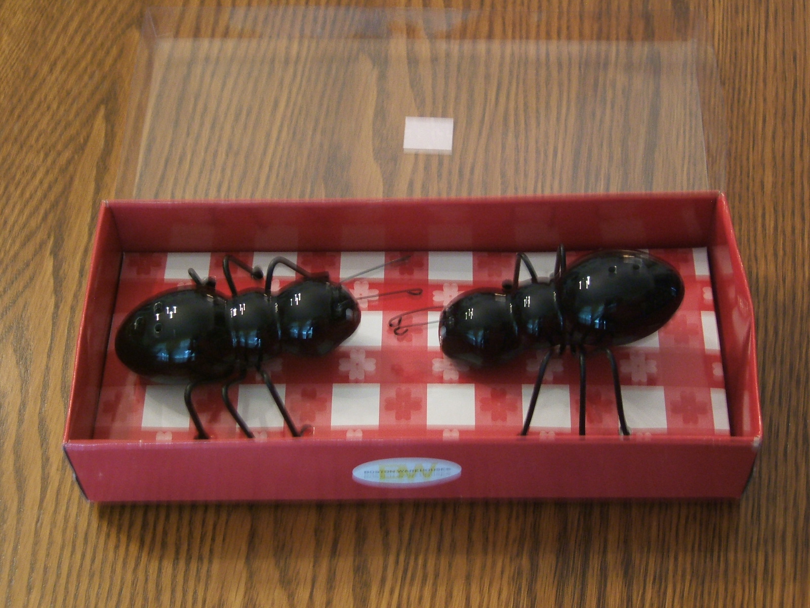 Cute ant shaped salt and pepper shakers by Boston Warehouse, new in box. $2.25. Sold.