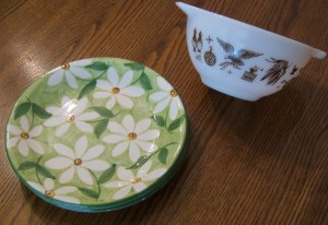 During another lunchtime visit (but I’m not obsessed, remember) to the Salvation Army thrift store, I found these. A pyrex mixing bowl and two flowery plates which make me smile.