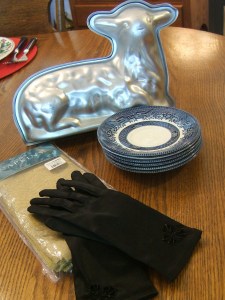 The girl’s black gloves, which appear to be vintage, and the sweet little lamb cake mold were found at the other community sale. The seller’s mother-in-law had gone into assisted-living and these had been her things.