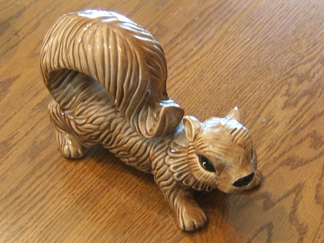 Since I was empty-handed we headed to the next town so I could shop at one of my favorite thrifts. My friend “S” had spotted something she thought I might be interested in. I was about a week late getting there to check for this item and was hoping it was still there for me to see. They had moved him from plain sight and tucked him at the back of a bottom shelf that hold dishes. It’s a good thing I always check those shelves or I would have missed this adorable little squirrel by Arnels. Thanks for the spot, “S”!