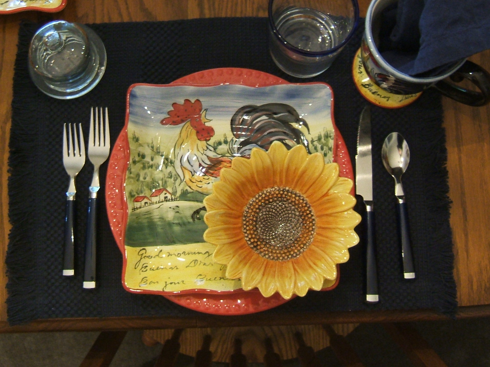 I used a thrift store red dinner plate to anchor the rooster dinner plate on the blue placemat. To add a little interest I added a sunflower bowl from Cracker Barrel.