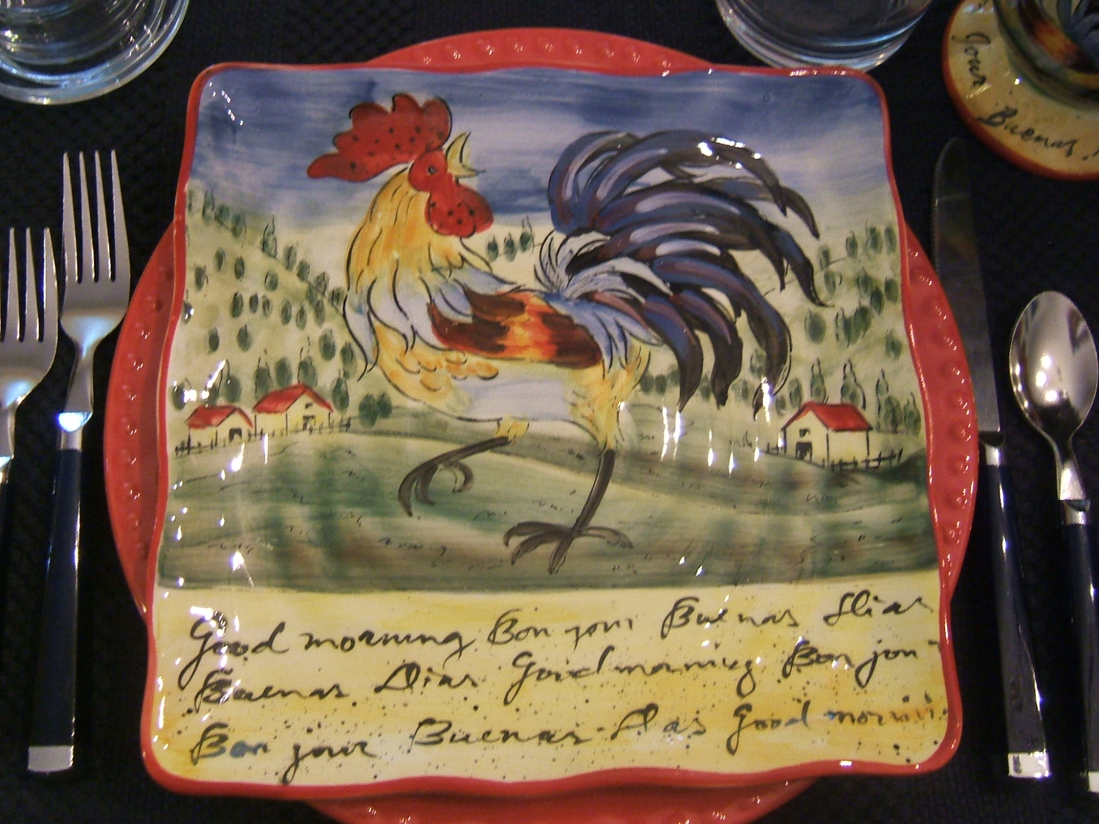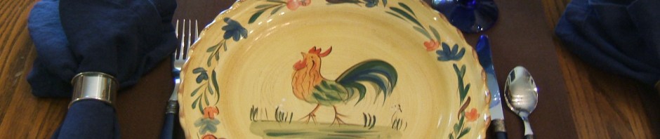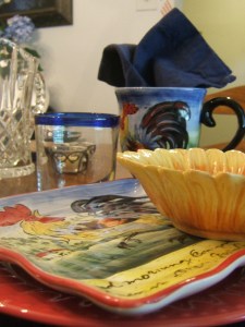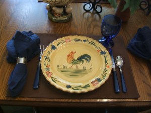 My good old blue napkins are pressed into service once again as are the blue goblets from Fortessa. This little rooster is singing his heart out to all who will listen.
