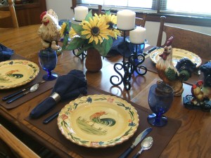 It’s time for Sheila at Note Songs’, Heart of the Home Party – Roosters and Chickens – and my roosters wanted to join the party. I am sharing some photos of two rooster-themed tablescapes I set BB (Before Blog).