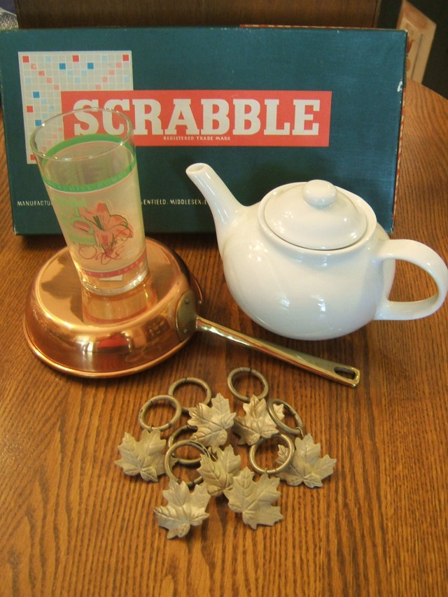 I had another successful week of thrifting and yard sales. My latest lunchtime thrift visit prompted me to go back the next day. On the first day of shopping, I found a Scrabble game and bought it, because in my book, one cannot have too many Scrabble games. The wooden tiles are going to enhance one of my apothecary jars in the near future.