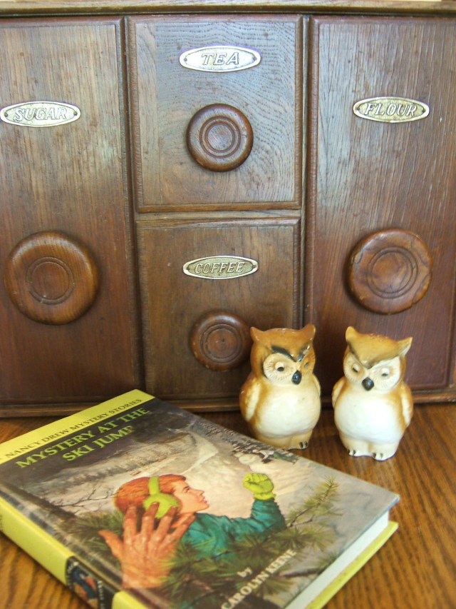 Our last stop at a well-signed yard sale found two granddaughters selling their Granny’s goodies. I bought a sweet wooden storage box for flour, sugar, coffee and tea for $3. Also coming home with me for $2 were owl salt and pepper shakers marked Japan on their bottoms, but missing their stoppers, and a Nancy Drew mystery I don’t think I have, so for a quarter, I took the chance. These were some very friendly ladies. I definitely hit the jackpot of friendly folks today.
