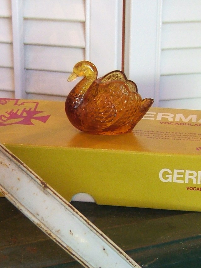 The vintage metal picnic basket has seen better days, but was too cute to pass up. The two cheese domes will one day be transformed into something special courtesy of the wonderful ideas I have seen in blogland. The amber swan was so sweet and priced just right to come home with me. When I saw the box of German vocabulary words, it reminded me I need to brush up on my German. Maybe I will choose a few cards each day to help me practice.