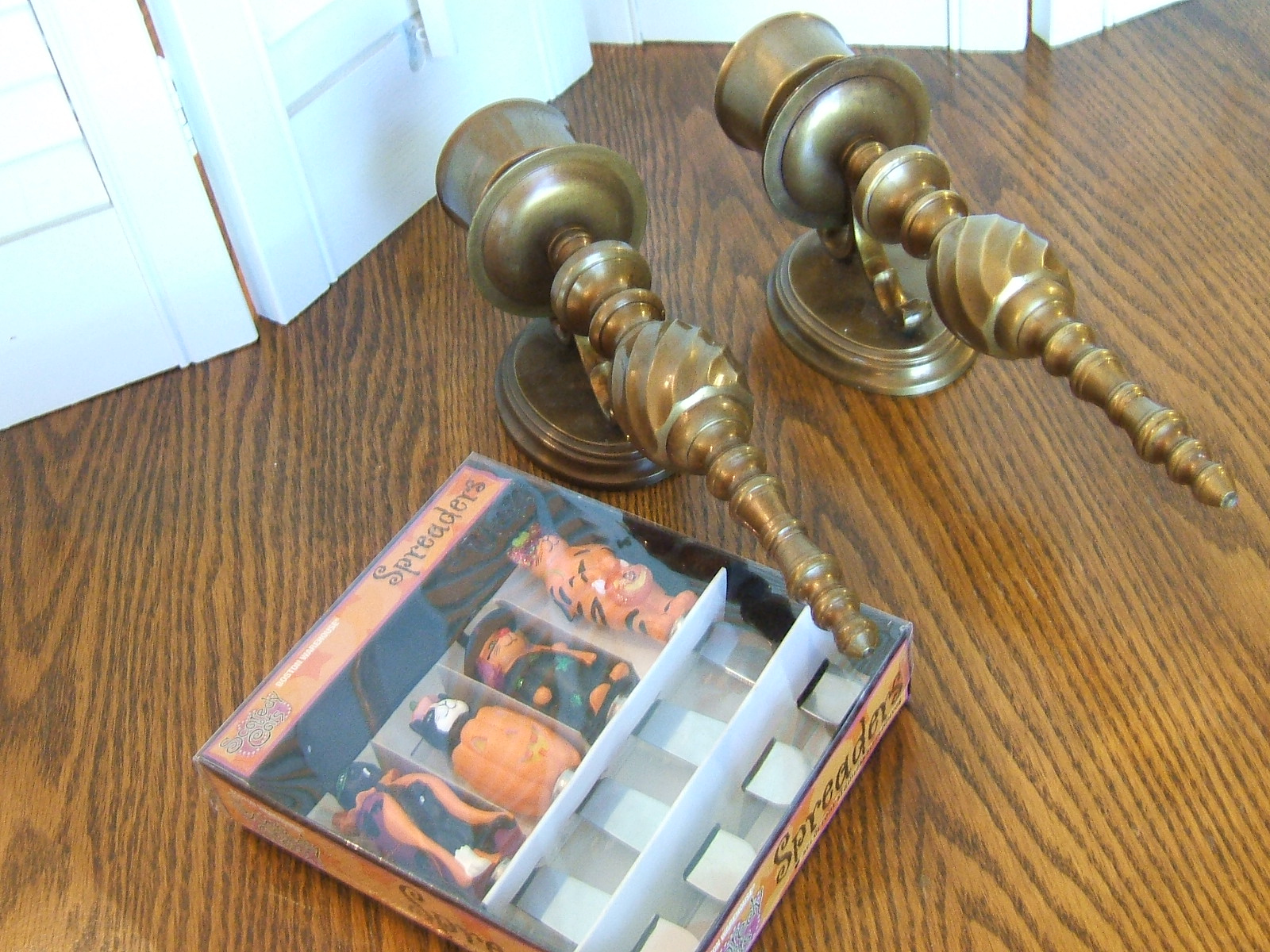 Another sale had these brass sconces. I thought the design on them was interesting and for yard sale prices I can paint them should I decide to do so and feel no pain. The Halloween spreaders are for my daughter who loves everything Halloween.