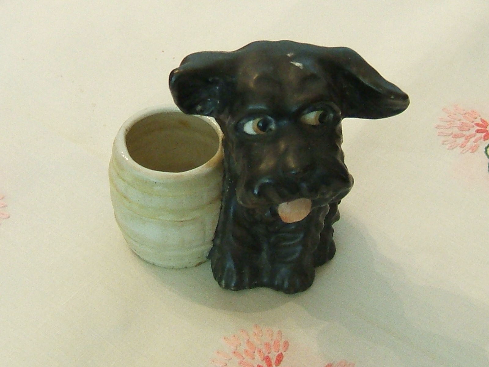 Sitting alongside the sweet scottie was a little Made In Japan black dog with barrel. I almost left him behind, but my thrifting friend “S” petitioned for him so he came along as well.