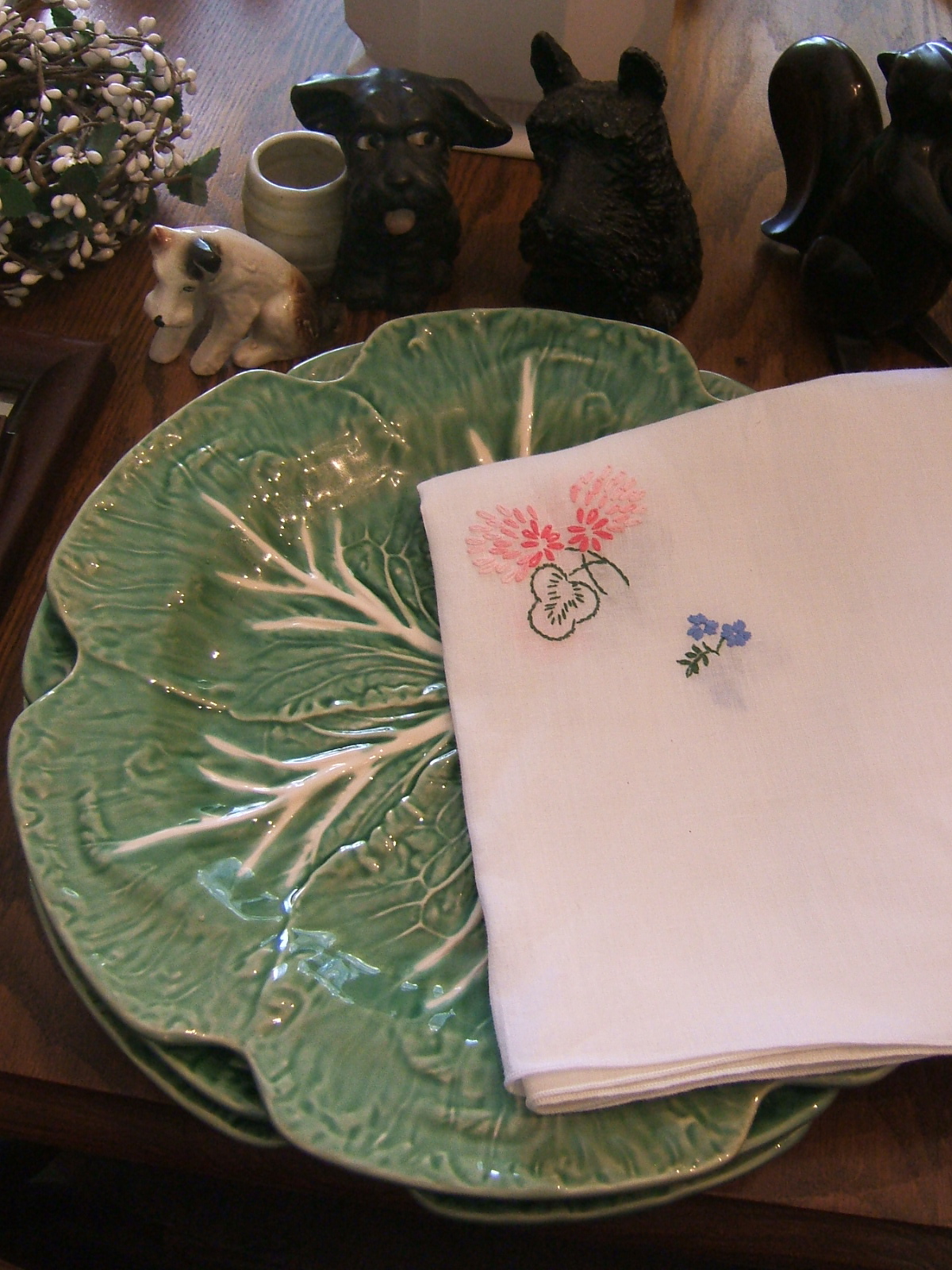 Three of the doggies from last week’s post were also part of my purchase. And I added three large dinner/charger Bordallo Pinheiro cabbage plates. These just came into the shop while we were there and were not yet marked. I had seen two smaller versions priced at $19 each so I wasn’t even going to ask about these figuring they would be well over that price. “S” asked the shop owner who was still bringing items in. She said $4 each. Sold! Thanks, “S”!