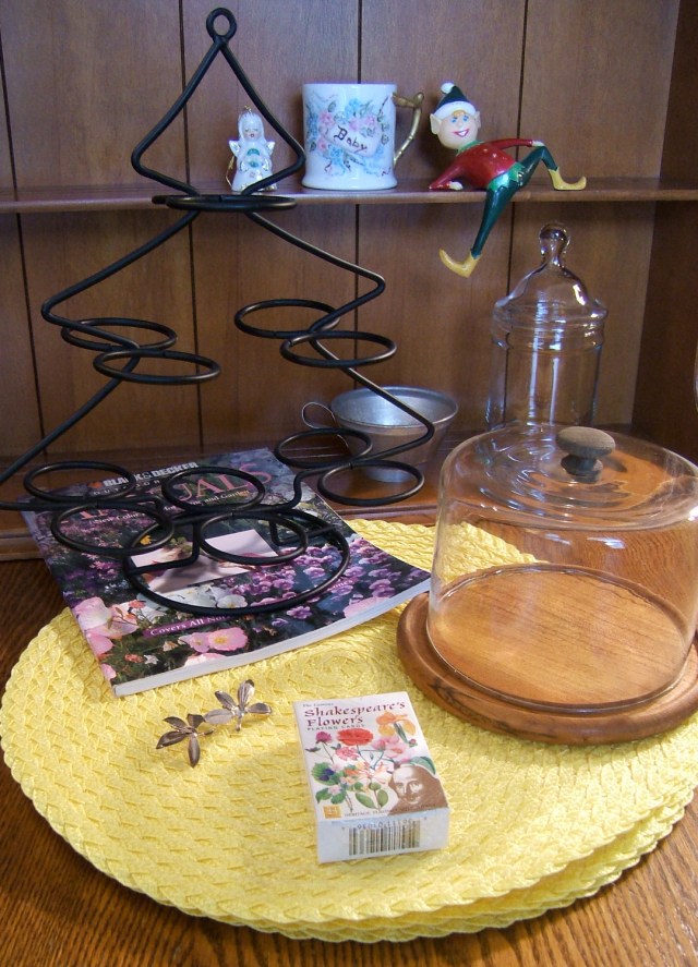 I found some really fun things. Last week I showed you the little momma dog and puppy figure I purchased at this sale. I also found a Snoopy thermos just like one I had when I was younger. Some of the other things I found are two Wilton cake pans, some Southern Living at Home metal votives and square container, two rose colored tiny glass dishes (possibly ashtrays back in the day), two mirrors and a cloche-like lidded butter container.