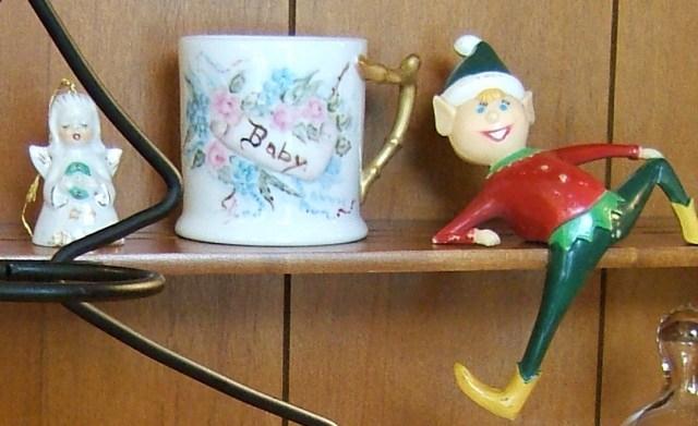 I don’t know if this little Baby cup is vintage, but it certainly has a vintage look. The little vintage angel is marked Japan. The elf was so mischievous looking that he jumped right in my bag. He is not vintage, just cute and certainly not modest.