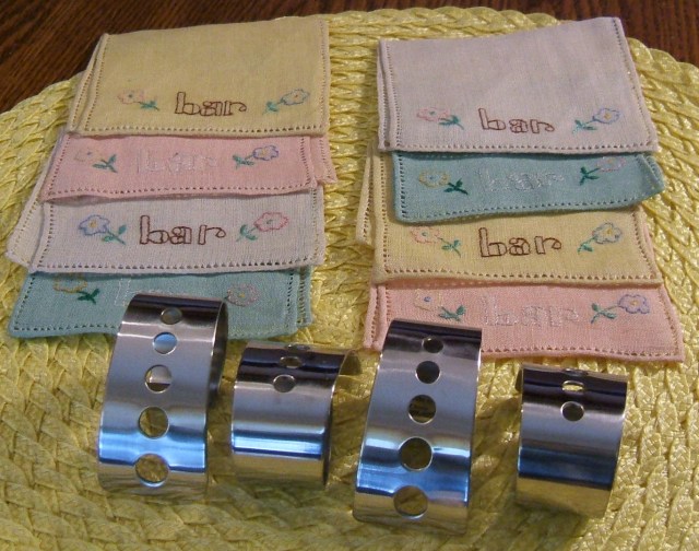 A sale at a local nursing home yielded these goodies – something old and something new. (At least I think these linen “Bar” napkins are vintage. The napkin rings are most definitely new.)