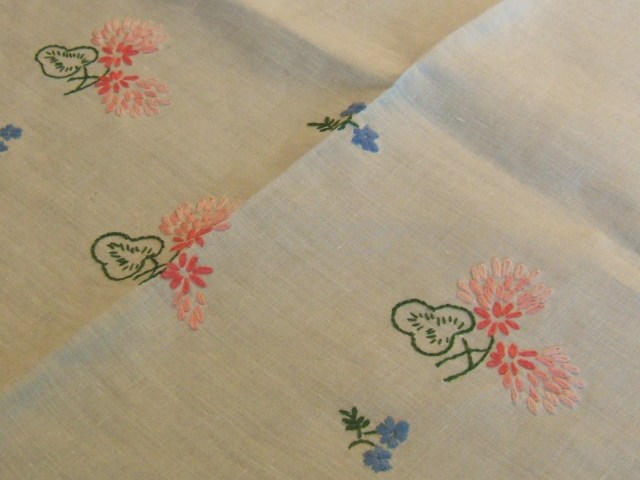 “S” and I finally made it to the consignment shop to spend our coupons. After shopping yard sales all morning, the prices were a bit of a sticker shock to us. We both eyed this sweet embroidered tablecloth and decided it was in pristine condition.
