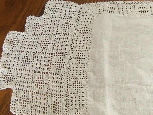 This was part of a three-piece set for $2. Isn’t the edging so pretty? This piece has edging on both ends; the other two pieces are smaller and are edged on just one end. I can imagine the set displayed on a dresser and night stands.