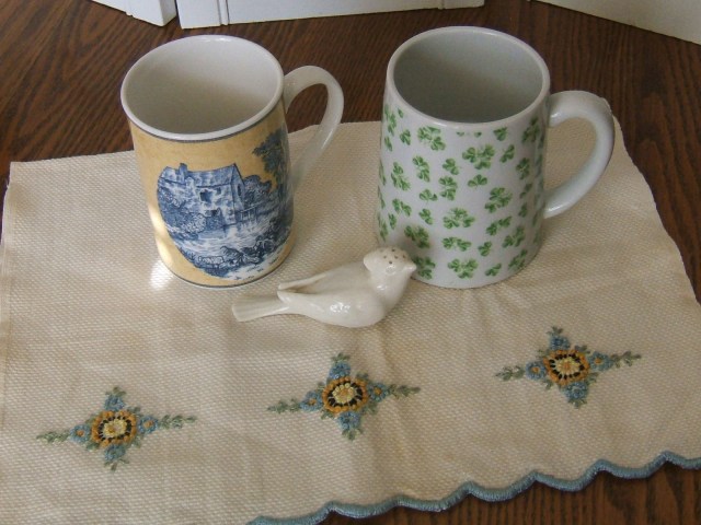 I found three mugs; two are pictured below. The third mug featured some pretty birds admired by my mother-in-law so that one stayed at her house.