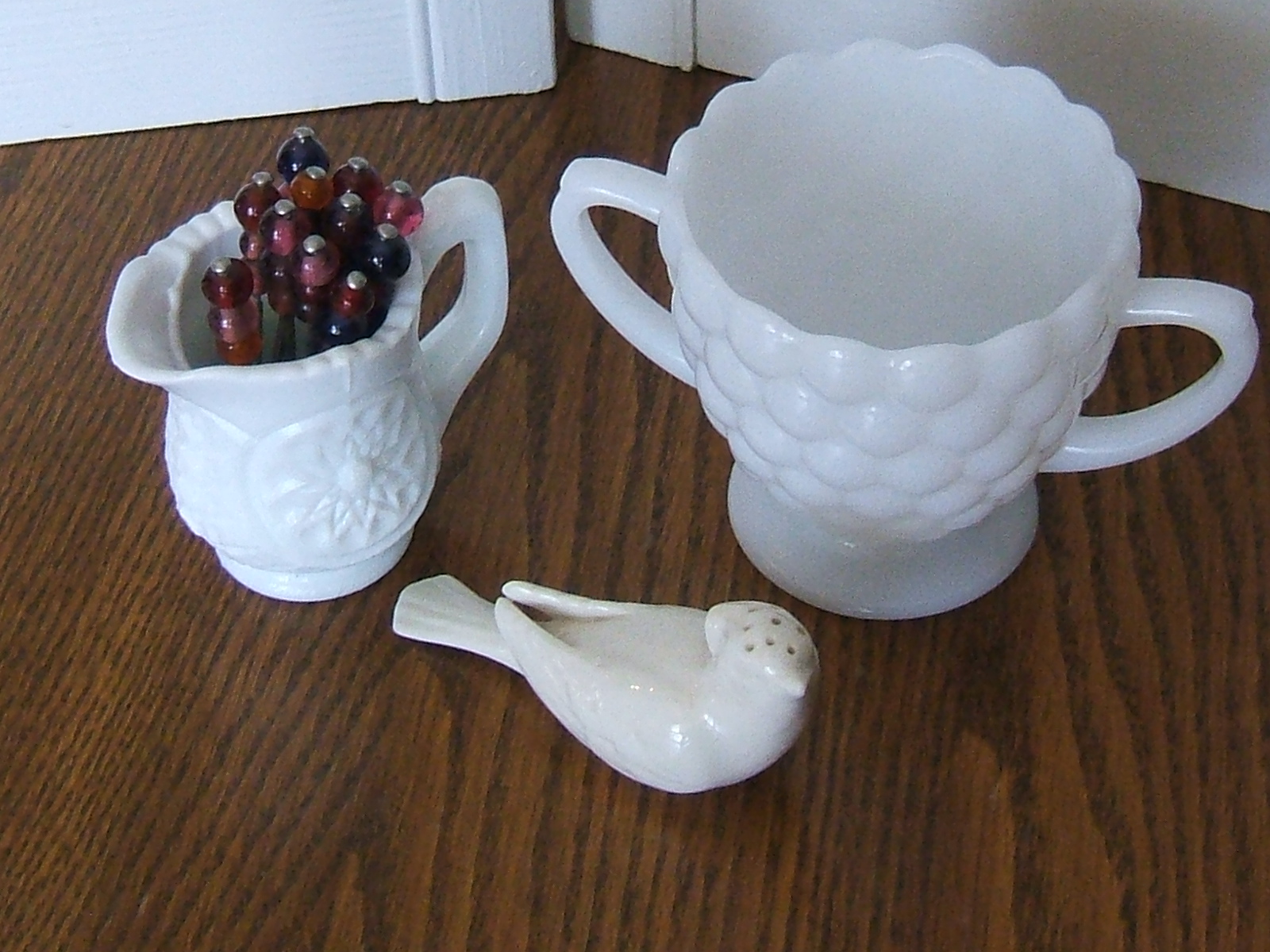 I also found a milk glass sugar bowl, a little white pitcher and some beaded hors d’oeuvres picks. The total of the items in these two photos was less than $4.
