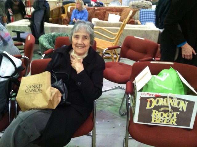 This is my mother-in-law guarding our purchases. She found two beautiful plates which I wish I had gotten a picture of. Over the years she has purchased some really lovely things for herself and her family at this sale.