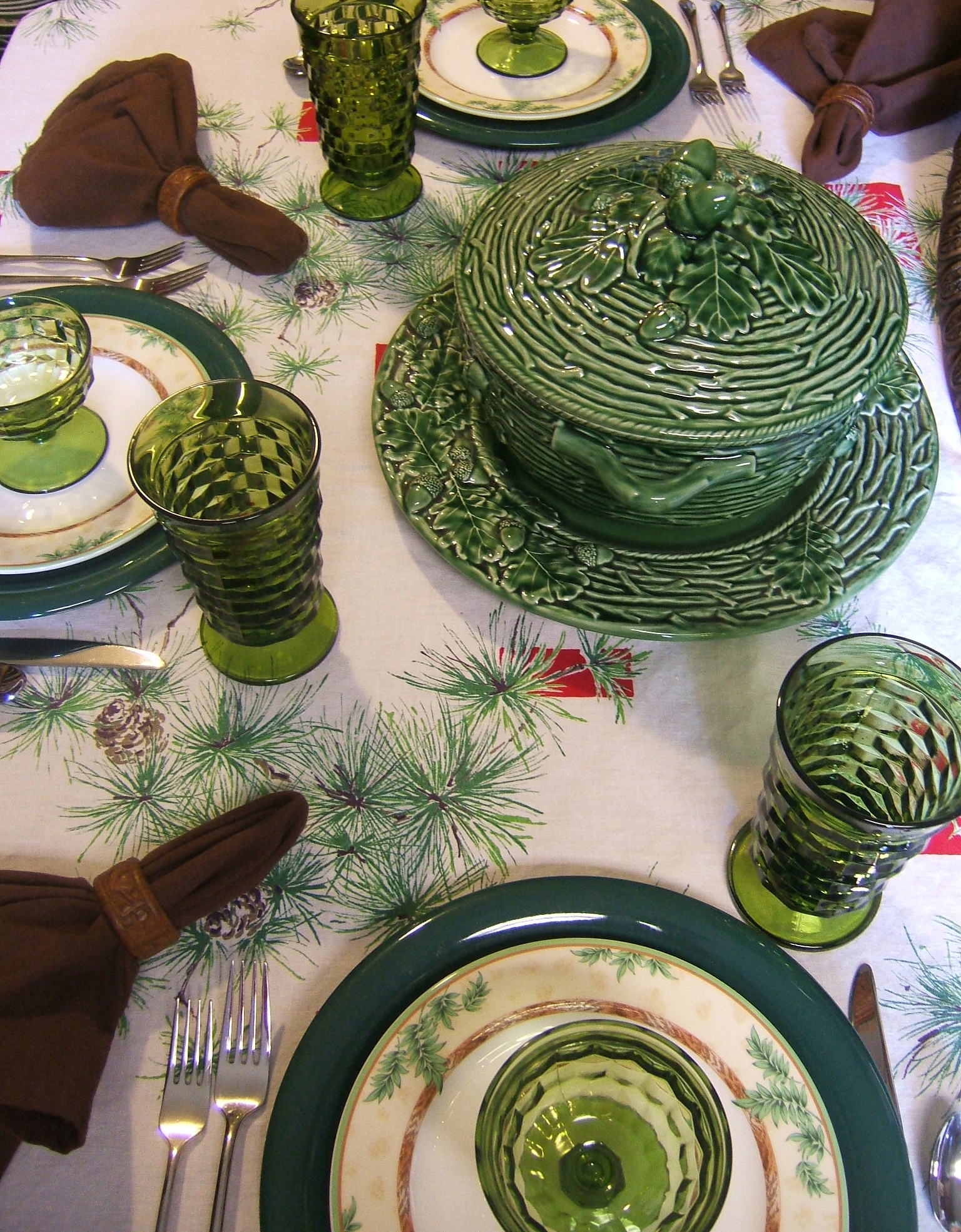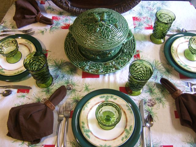 My head is spinning over the price you paid for that tureen set! Love the tablecloth with it’s touches of red, the plates and drinkware in shades of green, and the brown napkins picking up the color in the top plate! All very, very pretty!