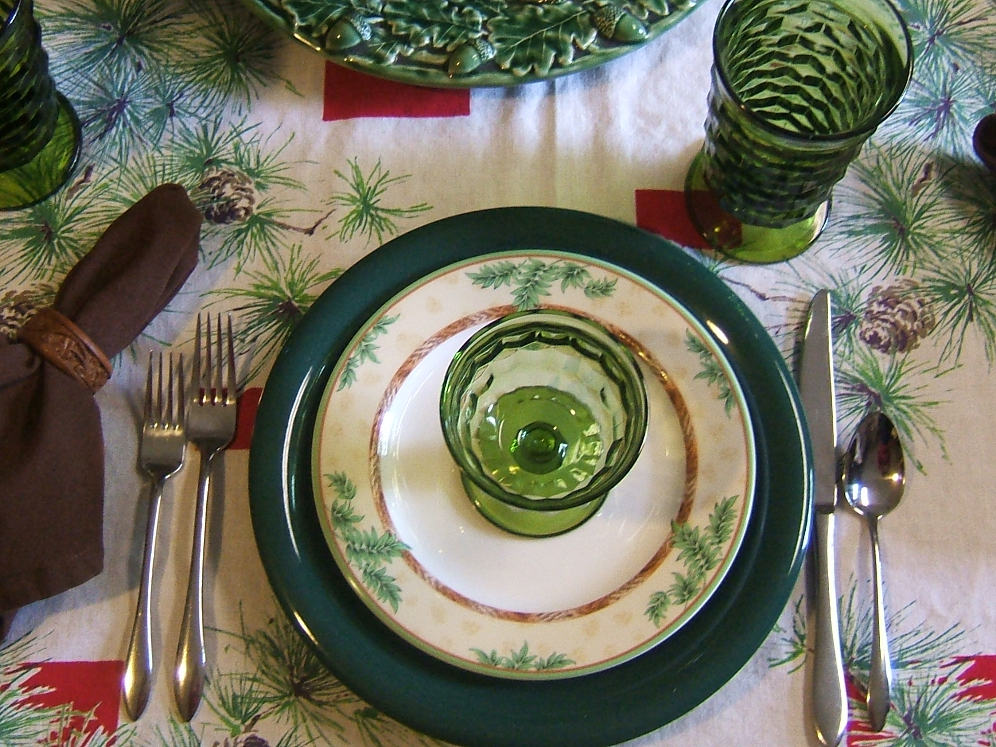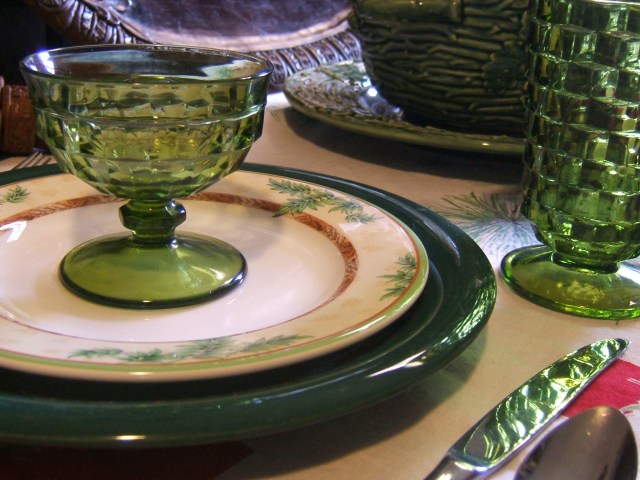 I’m also using the green Whitehall glasses and compotes I found at a thrift shop. The flatware is a Dansk pattern we have had for years. It came from the Dansk outlet which has since closed; I still miss that store! I used brown Bed, Bath & Beyond napkins from my napkin stash with yard sale wooden napkin rings.