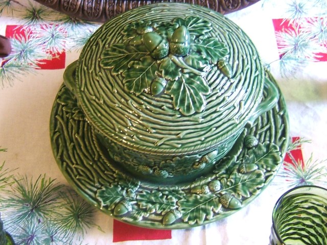Also featured is this fabulous tureen I snagged at one of my favorite thrifts. I couldn’t believe the super price on this piece, which also came with six matching soup bowls. It is a Bordallo Pinheiro set for which I paid $18. Yes, you read that correcty, $18. Wowser!