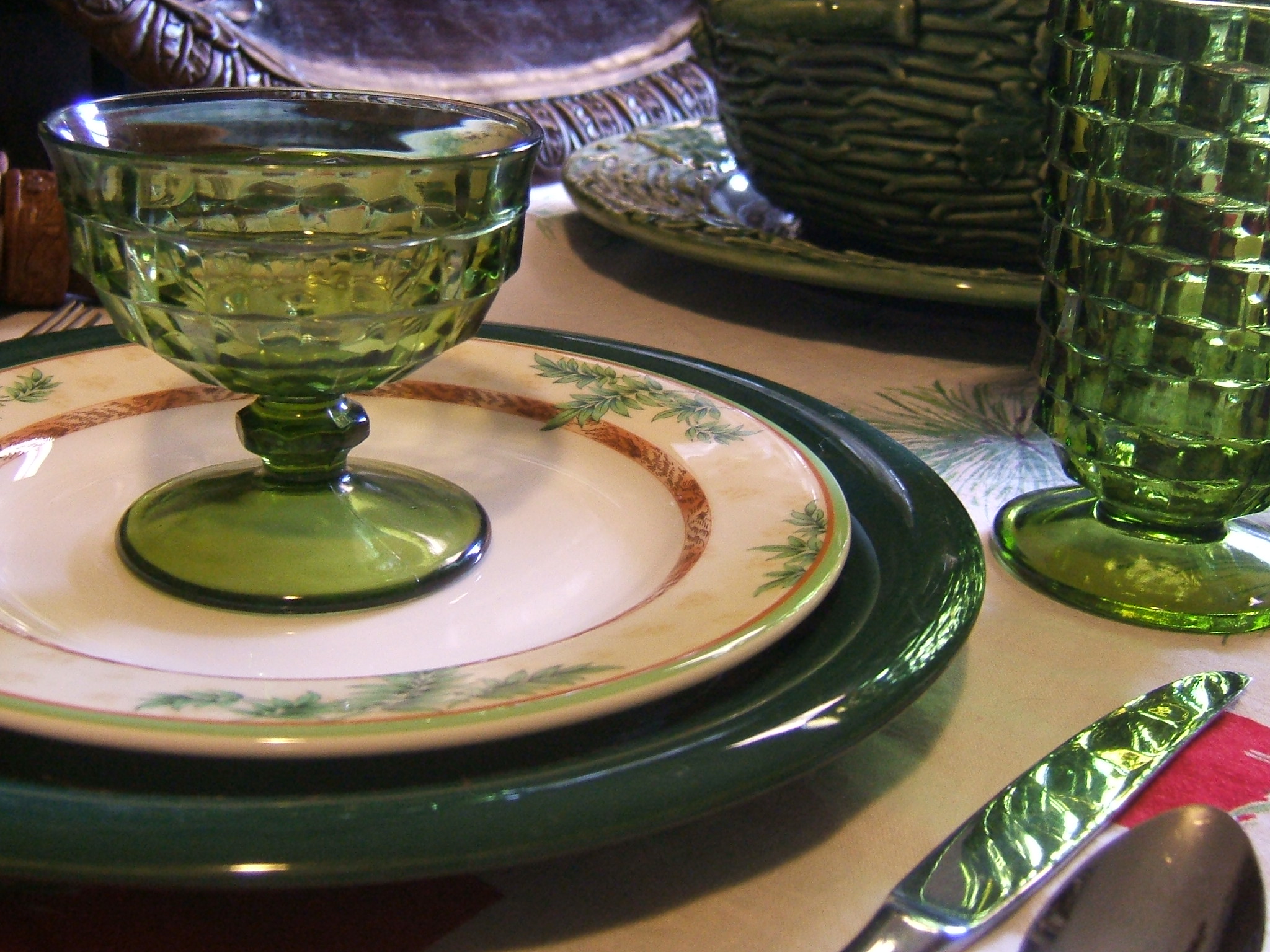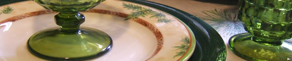Love your table! I received a set of those green glasses as a wedding present in 1977. We used them for years; they were great glasses. Wish I still had them! 🙂 ]