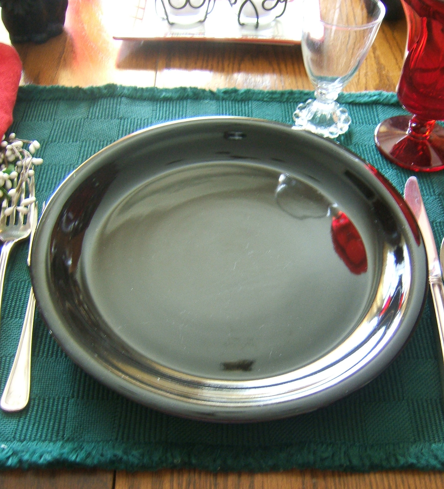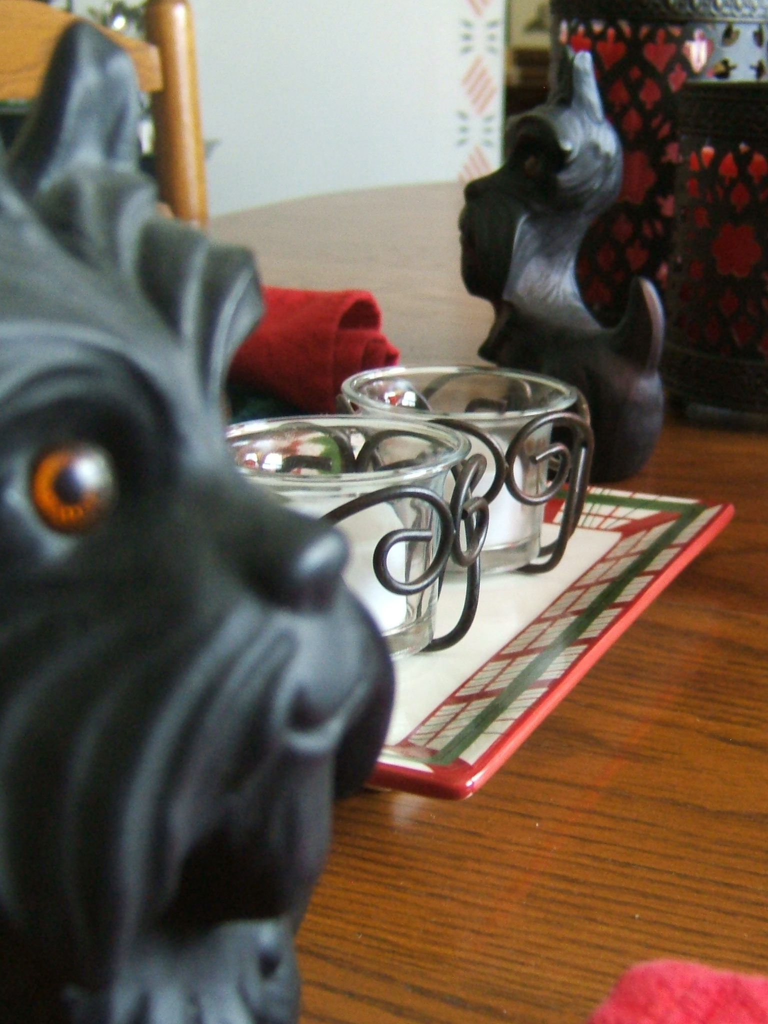 You can see the ceramic Scotties I bought at a hospital thrift shop after being alerted to their presence by Amy T. They are keeping watch over this setting.