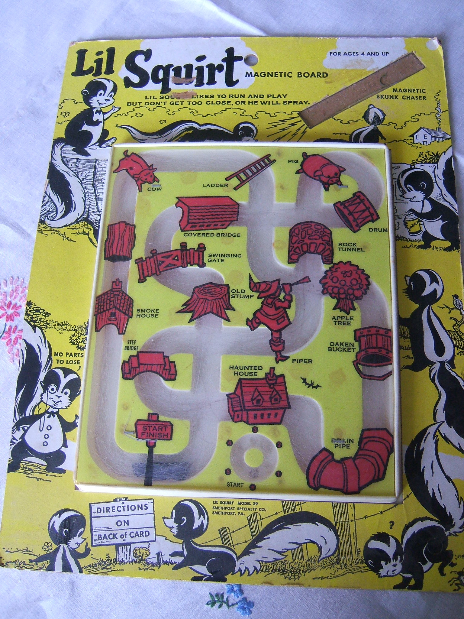 The graphics on this Lil Squirt magnetic game attracted me. My husband was delighted to see this find as he fondly remembered many hours of playing Lil Squirt. Once I locate a magnet we will be trying out this Lil Squirt game.
