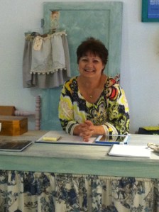 was imminent. A friend and I decided to fly into The Empty Nest today. Getting to meet the woman behind the blog and to see her creations in person was icing on the cake. Here is sweet Janet at her shop desk: