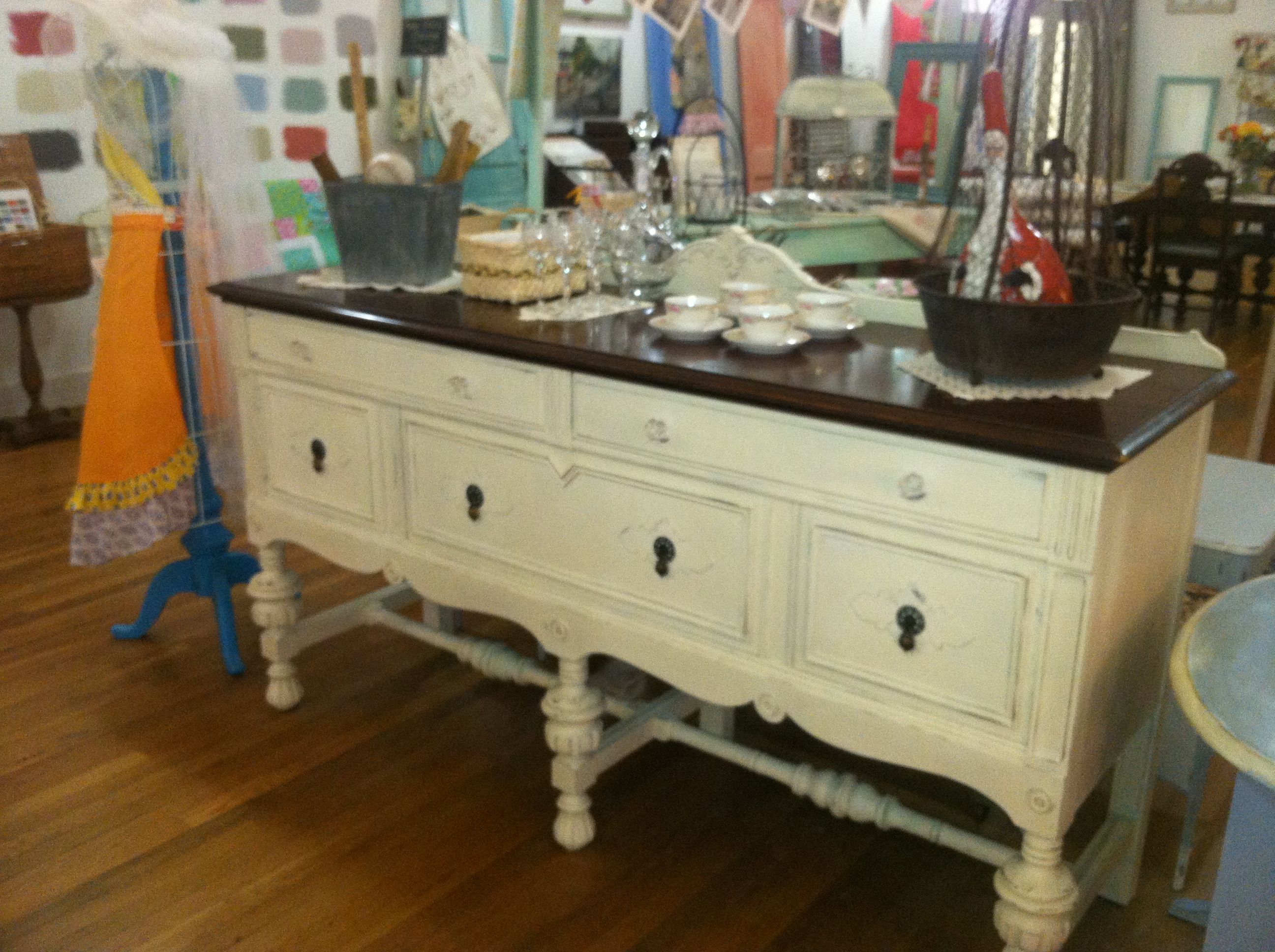 I fell in love with this buffet. It really was a good thing we didn’t have room in the car for this. (Not to mention there is no room in my house, but that wouldn’t have stopped me if we could have transported this beauty home.) This is a totally gorgeous piece finished in ASCP Old White with clear wax. Janet left the top in its original finish. Just a stunning piece!