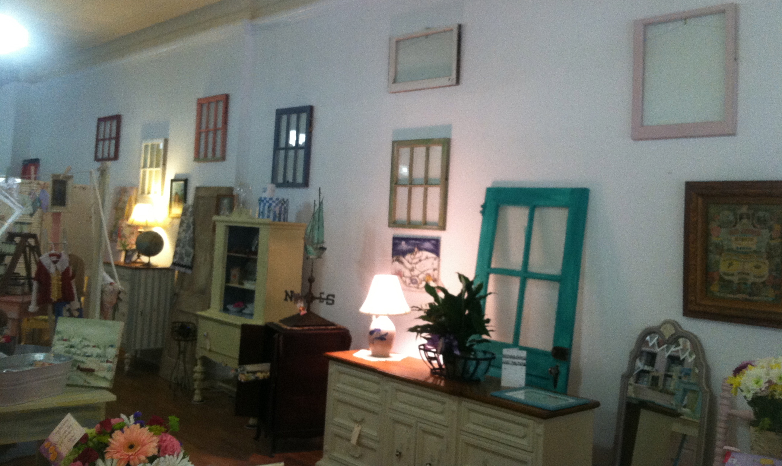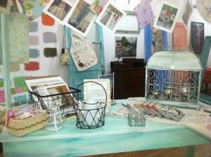 Janet has scattered salvaged window frames about the walls of her shop. Each frame is painted in an ASCP color.