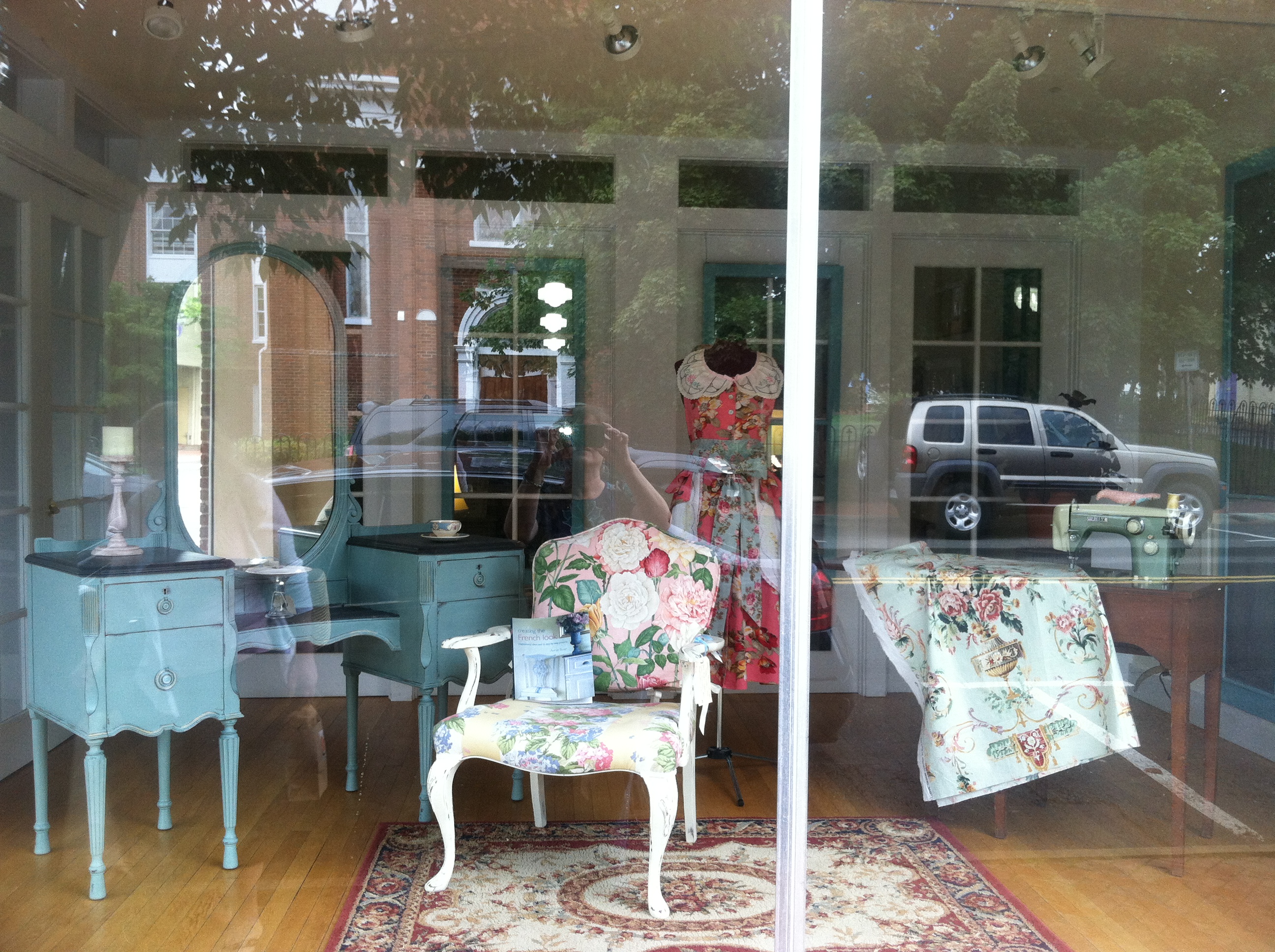 Isn’t she just the cutest thing? For those who don’t live close enough to pop by the shop, I’ll share several photos from my little iPhone camera. First up is the front display window as seen from the sidewalk outside. Janet has arranged a little vignette of a sewing room. Can you make out the sewing machine on the right?